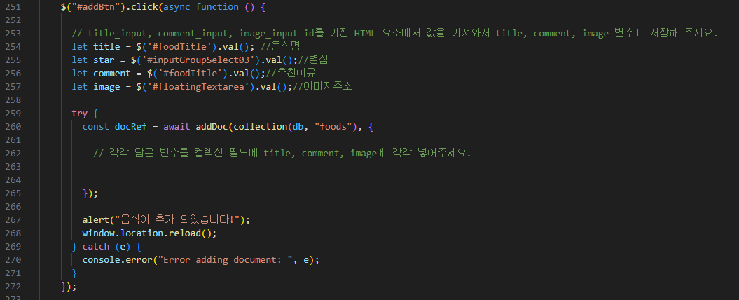 try : 안에 있는 내용이 정상적으로 실행되면 "음식이 추가 되었습니다!" 라는 메시지와 함께 페이지가 새로고침 됨