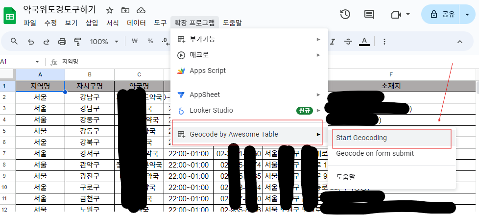 Geocode by Awesome Table => Start Geocoding 클릭